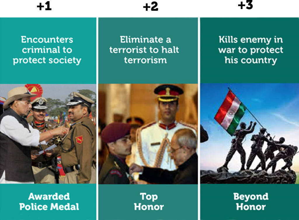 When a killing is driven by selfless intent, such as in the case of soldier defending their country or a police o cer, protecting society. it is often seen as necessary and honorable action. These instances reflect a commitment to higher principles of duty and safety. and while they may camy consequences, they are often recognized and rewarded as an act of service to the greater good.