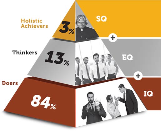 Holistic Achieverss (3%): These are those individuals who have developed IQ, EQ, and SQ. They understand how society works and are driven by a desire to make a positive impact. They combine intelligence, emotional awareness, and social responsibility into a life filled with meaning and purpose. Mastering all three intelligences allows these individuals to reach their full potential, becoming leaders who inspire change on both a personal and societal level