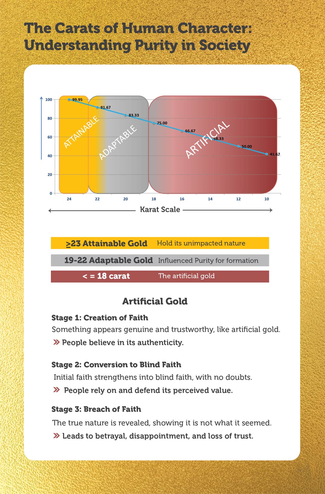 “Just as gold’s purity is measured in carats, a person’s worth can be seen in their character. 24-carat gold is pure and rare, 23-carat is highly valued, 19-22 carat is adaptable, while 18-carat and below individuals are seen as less genuine by society.”