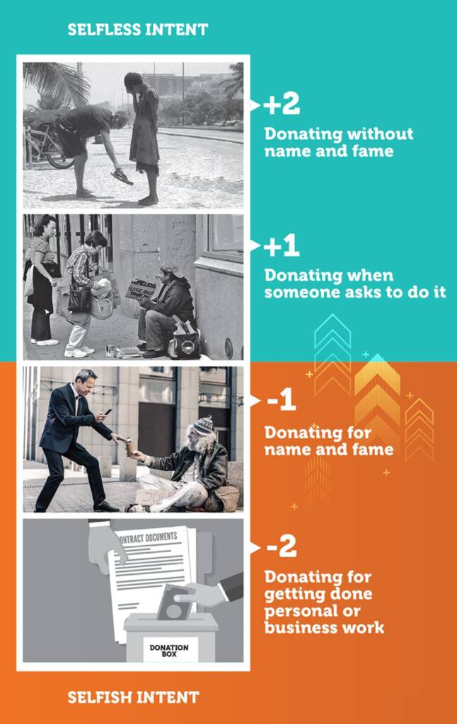 We have depicted in another photo, the act of Donation with Selfish and Selfless Intent. The result of such acts vary basis the Intent while doing an act. Even the amount of donation does not impact the result while Intent does.